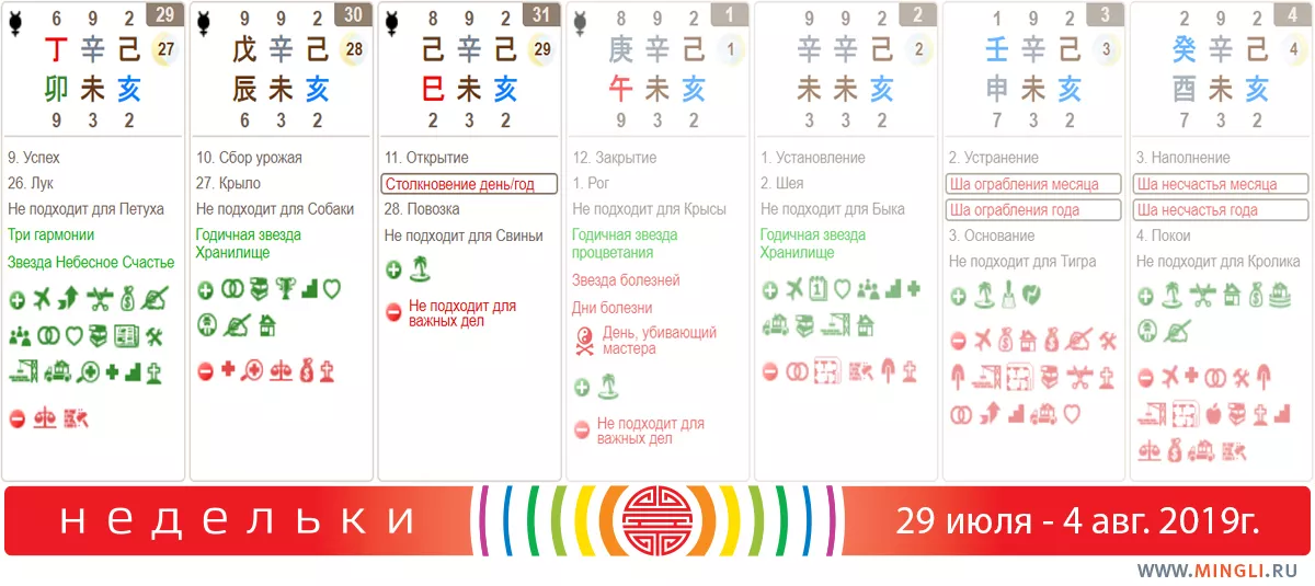 1 августа, четверг, продолжает тему отдыха) Во-первых, это день закрытия и первый лунный день - ци пока маловато для свершений. Фэншуисты отдыхают, соблюдая заветы Мастера Дуна. Также не рекомендуем вам посещать больницы, поликлиники и заболевших друзей.