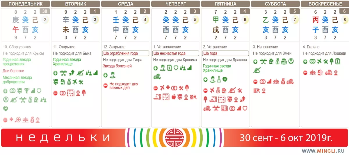 2 октября, среда. Не стоит начинать поездку, работать с документами, особенно подписывать финансовые бумаги. Если вы - слабые Земля, Огонь или Металл - не планируйте на сегодня и завтра важных дел, не принимайте окончательные решения. Кстати, на этой неделе очень благоприятно сходить на массаж или стоун-терапию.