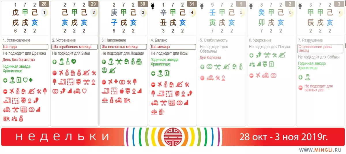 Небольшое лирическое вступление. Прошлый раз задали вопрос: «Как так, день хороший, а для меня прошел плохо. Почему?» Выбор дат имеет несколько уровней. Во-первых, энергия самих дней. День может быть более или менее конфликтный, с хорошими или плохими «звездами», подходящий для тех или иных дел. Но важен и сам человек. Ведь у каждого есть свои собственные полезные элементы, день может по особенному взаимодействовать с картой Бацзы (датой рождения, записанной с помощью иероглифов), принося или хорошее, или плохое. Это уже второй уровень выбора дат, который сложно отразить в общих прогнозах. Этот уровень выбора дат отражен у нас в персональном календаре, который можно заказать на сайте. И тогда вы будете видеть именно свои плохие и хорошие дни и часы.