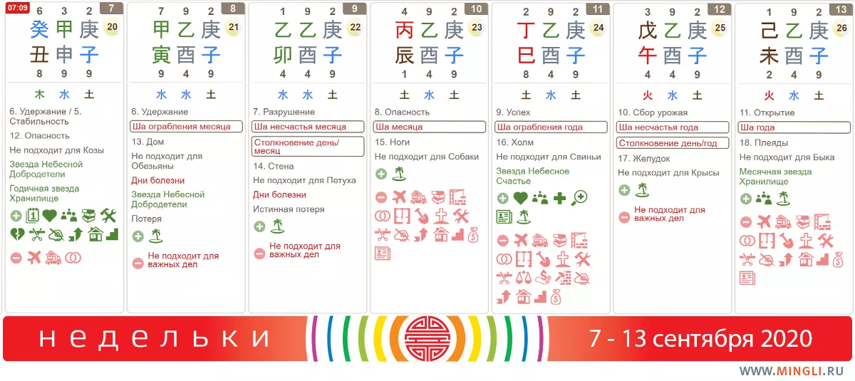 7 сентября, понедельник. День неплохой, но часто первый день месяца не рекомендован для важных дел именно из-за смены энергий и царящей из-за этого энергетической неразберихи). Но все же дела средней важности вполне подойдут: проводите встречи, договаривайтесь, миритесь, приобретайте ценные вещи. Начинать ремонт или работы в саду на этой неделе можно только сегодня.