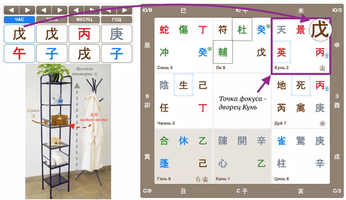 У нашей студентки возник вопрос о пропаже, пропала вещь! Где искать потеряшку? Построен расклад, в таблице расклада найден Небесный ствол часа 戊. Это и будет пропавшая вещь. «Ага!» – это дворец Кунь, юго-запад.