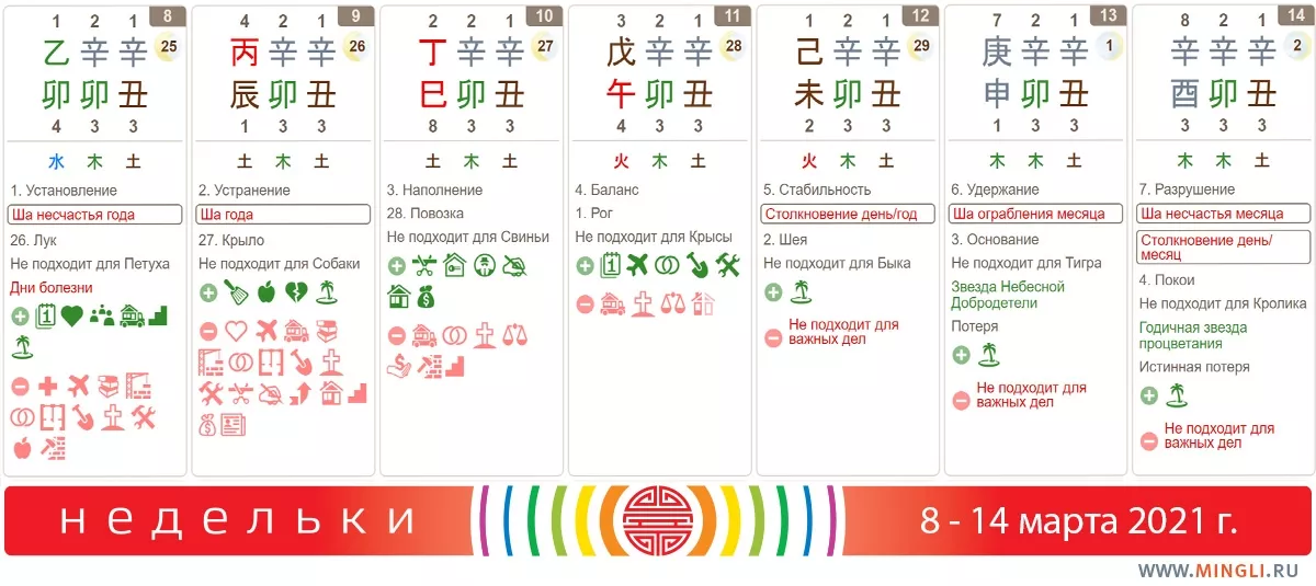 14 марта. воскресенье. Бережнее с этим днем. Загляните в свою карту бацзы и если видите там иньское Дерево, Кролика, пару Кролик-Петух, особенно иньский металл на Кролике или иньский Металл на Петухе - лучше спокойно (подчеркиваю: спокойно) отдыхать. Экстремальные виды спорта сегодня противопоказаны, как и любые потенциально травмоопасные дела. Даже физкультурой не стоит начинать заниматься, особенно если сегодня вы хотите начать. Даже на маникюре/педикюре есть шанс получить порез. Для начала: бизнеса, проекта, отношений день также не подходит, в этом плане он похож на предыдущей - потеря времени и все. Так что опять отдыхаем) Да, иньским Деревьям, особенно слабым и без Воды сверху, в небесных стволах карты, показана жесткая дисциплина; можно заняться вышиванием)