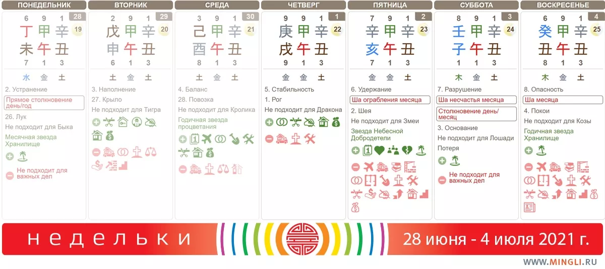 Заканчивается месяц Лошади, а следом за ним начнется месяц Козы. Бык года и Коза месяца все время будут “бодаться” и создавать потенциал для конфликтов. Поэтому супер-важные дела, особенно, если Бык и Коза в вашей карте присутствуют, лучше сделать до 7 июля. На этой неделе как раз найдется для них денек со вторника по четверг.