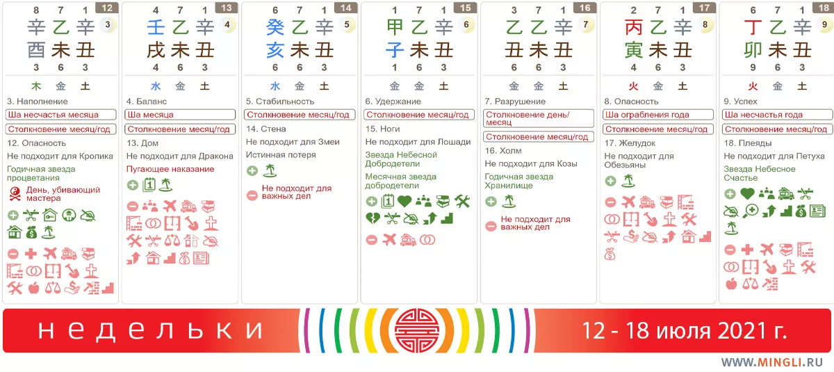 16 июля, пятница. Сегодня лучше поставить дела на паузу и не планировать поездок (особенно после обеда, в час Козы в вашем городе), серьезных встреч, экстремальных экспериментов с телом и здоровьем и посещения крупномасштабных мероприятий. В первую очередь - это совет для тех, у кого в карте есть Иньское Дерево на Козе или на Быке, Иньский Металл на Быке или Козе, а также просто Бык и Коза. Берегите отношения, постарайтесь не решать важные вопросы. В случае крайней необходимости выбирайте хороший час, например, Обезьяны или поздней Крысы. Не для всех день плох, кто-то сможет серьезно обогатиться. Но это надо смотреть уже по личной карте бацзы.