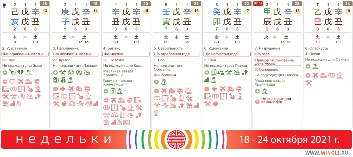 20 октября, среда. Металл довольно силен в этот день, так что, если он вам полезен - важные дела планировать можно, например, покупку ценных приобретений. Но, если у вас в карте есть столп иньский Металл на Быке, то лучше притормозить - дубликат дня и года может сказаться неожиданным образом, не факт, что вам понравится.
