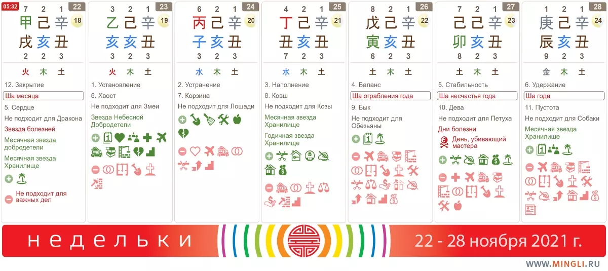 23 ноября, вторник. Годится для дел повседневных и средней важности. Довольно сильное, хотя мокрое и холодное Дерево правит днем, там что если это - ваши полезные элементы - можете действовать. Прекрасно подойдет для планирования, свиданий, переговоров, общения, перемещения и переезда (если вы не Змея). Сегодня (а еще в среду) можно начинать ремонт или земляные работы).