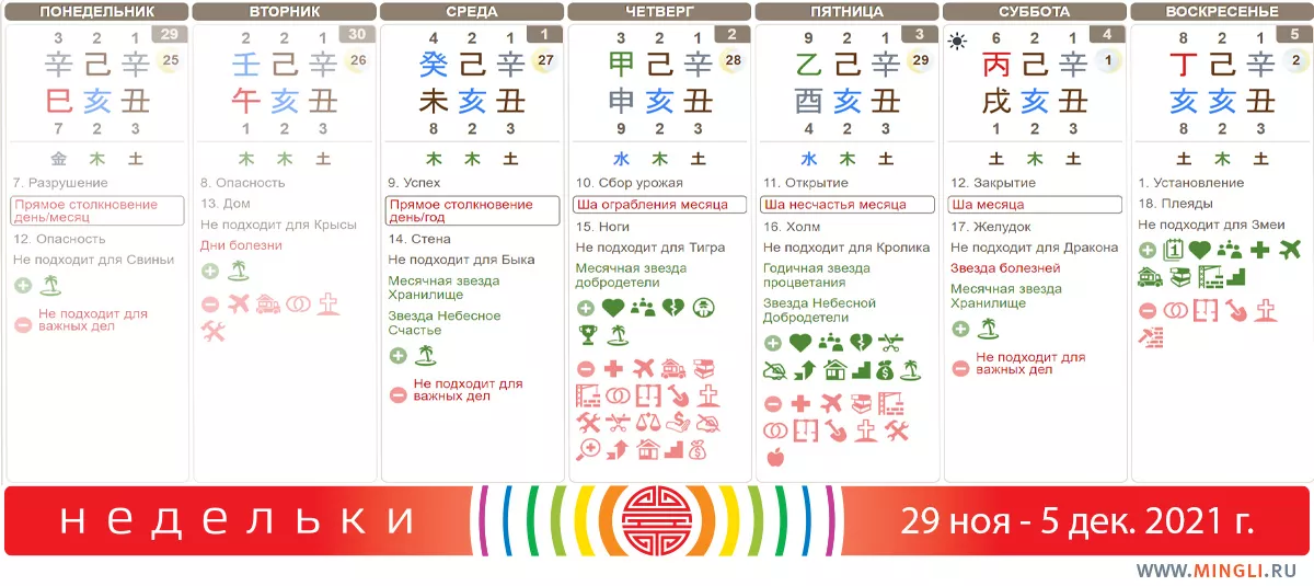 29 ноября, понедельник. В плане рабочей активности делаем вид, что неделя еще не началась). Шучу. Главное – не планировать на понедельник чего-то очень важного. Тем, у кого в карте бацзы есть Свинки и/или Змеи, лучше провести день спокойно, поберечь себя, не нервничать.