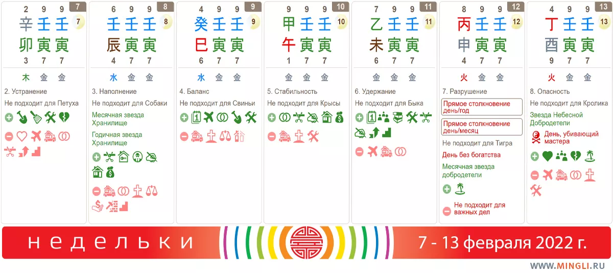 7 февраля, понедельник. Не самый лучший день для того, чтобы жениться или начинать строительство. Это провоцирует ссоры, судебные иски, расставания и приносит вред старшим членам семьи. Отлично подойдет для уборки и расставания. Попробуйте сбежать сегодня с работы пораньше, чтобы прогуляться на восток в час Обезьяны. Встретить можно человека в форме. Не подойдет прогулка Обезьянам, Тиграм и Петухам по году и дню.