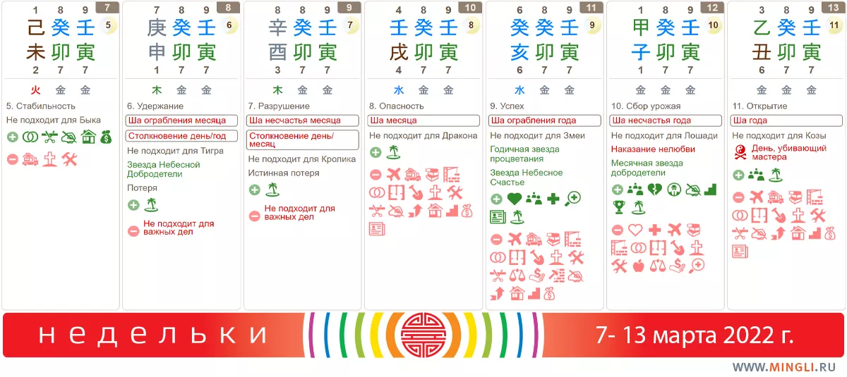 13 марта, воскресенье. Выходной для всех, в том числе и для фэншуистов – сегодня измерения компасом не принесут нужного результата. Для ремонта и земляных работ, как и большая часть недели, день не подходит. Хорош, разве что, для слабых Огня или иньского Дерева. Так что общение с друзьями – лучшее, что вы можете придумать.