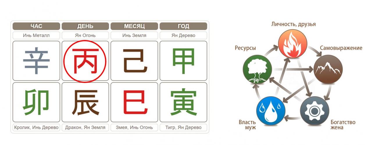 В бацзы, китайской астрологии каждый человек получает свою карту по дате рождения, 4 столпа. В дне стоит иероглиф – это ваш Господин Дня, элемент личности. В карте ниже это – Огонь. Рядом с картой вы увидите схемку 5 стихий.