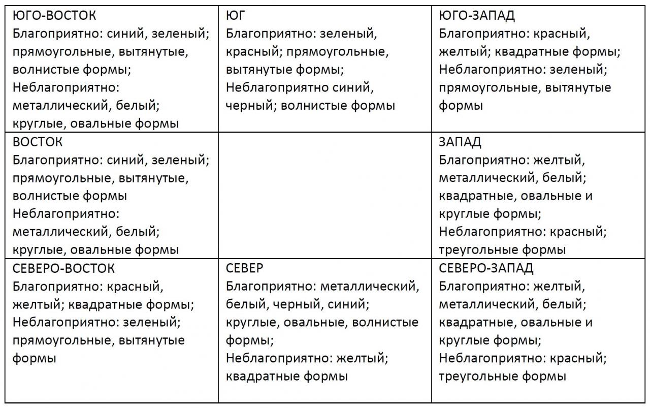 Для гармоничного восприятия в каждом секторе должны присутствовать все 5 стихий; однако, старайтесь избегать больших пятен цвета или повторения форм, неблагоприятных для каждого конкретного направления.