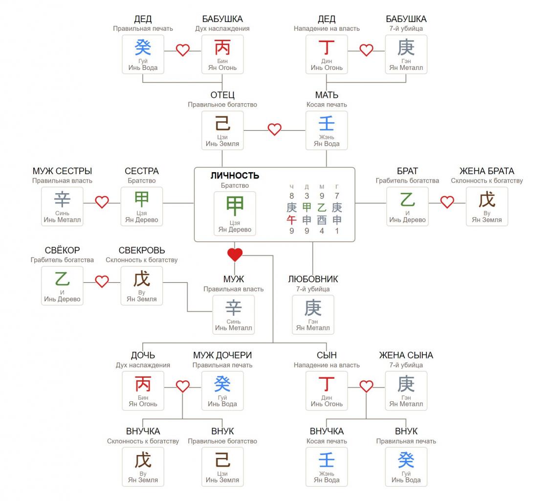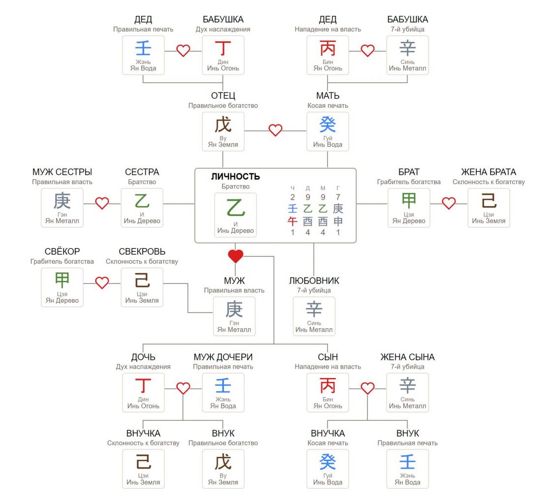 Во-первых, есть схема родственных связей человека. Она строится на основе правил У Син — системы порождения и контроля: