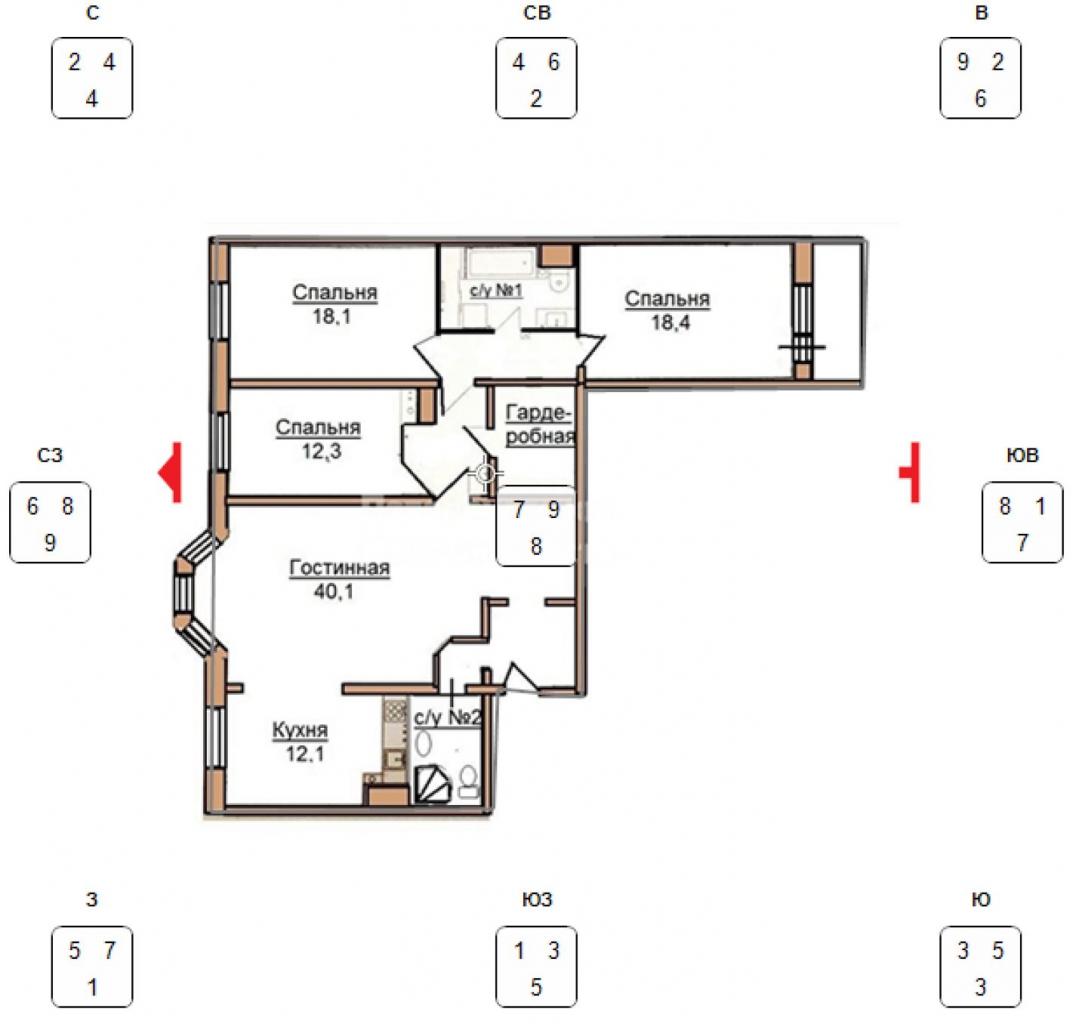 В этой квартире водная 9 попала в центр, и внешняя активность ей не поможет. А это значит, что потенциал финансового процветания такой квартиры в 9 периоде падает. В первом периоде он снизится еще больше.