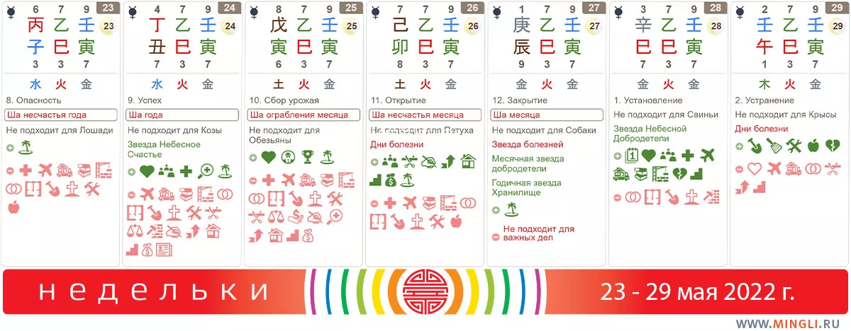 25 мая, среда. Максимум, для чего подойдет среда – это сбор долгов, и то, если вы уверены в своих аргументов. И день сам по себе слабоват, и ша ограбления диктует, что не стоит решать финансовые вопросы и подписывать важные документы. Повседневные и неважные дела можно делать без ограничений! В пути следите за своими вещами более пристально, чем обычно. Если в вашей карте бацзы есть Огненное наказание (Тигр, Обезьяна, Змея) – спокойно проведите час Обезьяны. Как правило, это время между обедом и ужином, примерно 15-17 часов; но лучше посмотреть точный временной интервал в своем городе.
