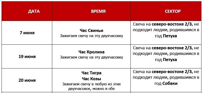 10, 22 июня дни сильного Огня. Если Огонь — это то, что вам нужно - используйте эти дни! Подходит для начала новой работы или вступления в должность, переговоров, посещения друзей, коммерческих сделок и операций. Можно обращаться за медицинской помощью, начинать путешествие или обучение. Хороший день для начала строительства, но нельзя закладывать фундамент или сносить старые постройки. Не подходят для рожденных в год Крысы!