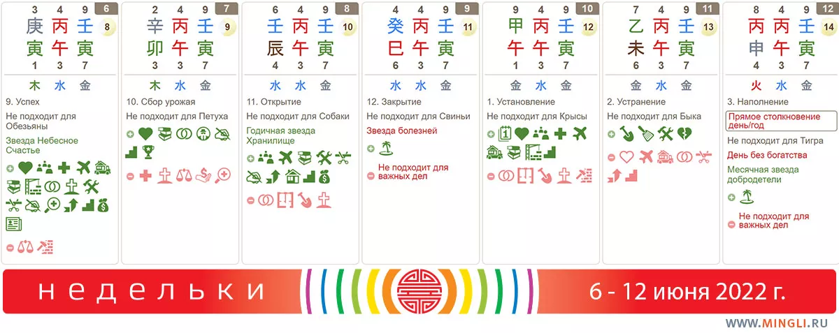 6 июня, понедельник. Очень благоприятный день практически для всего (если только вы не Обезьяна по году): для строительства, земляных работ, переезда в новый дом, начинания бизнеса и проектов. Действия принесут много праздников и богатства в течение 60-120 дней. У семьи будет хорошая репутация и крепкое здоровье. Сильный Металл Ян может подзаработать.