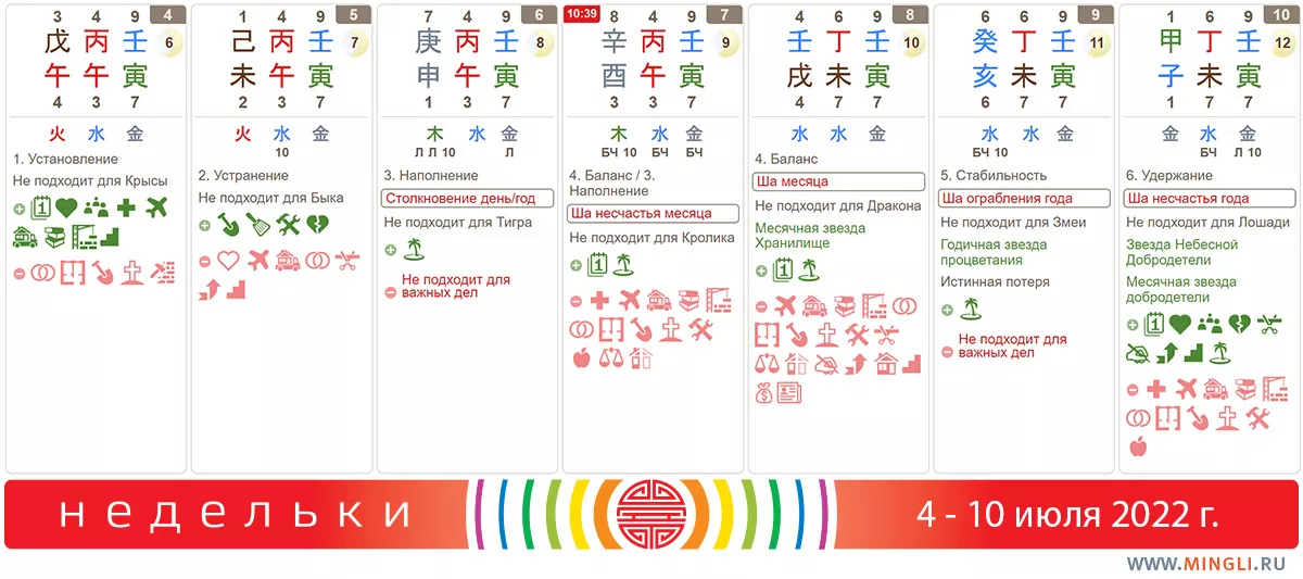 6 июля, среда. Столкновение Тигра и Обезьяны, поэтому день подходит только для повседневных занятий. Всем, у кого эти зверики присутствуют в карте бацзы, стоит быть внимательнее на дорогах, отложить занятия экстремальными видами спорта, сдерживать эмоции. На 6 и 7 июля надо также серьезнее посмотреть тем, у кого в карте бацзы сражаются Огонь и Металл – возможны обострения аллергий, нервные срывы.