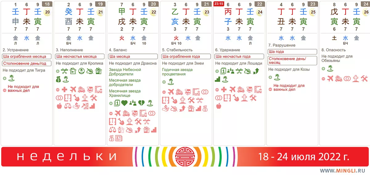 18 июля, понедельник. Начало недельки сразу «не задалось»: столкновение и ша ограбления. Ничего страшного, просто не планируйте на этот день слишком важных дел,особенно подписание важных документов, финансовые дела, начало путешествия. В первую очередь это относится к тем, у кого в карте рождения есть Тигр и Обезьяна.