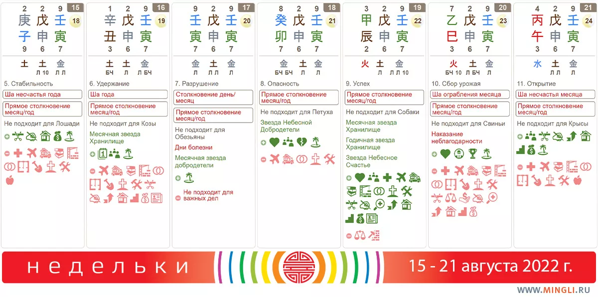 15 августа, понедельник. Довольно сильный день за исключением некоторых ограничений: не стоит начинать ремонт, земляные работы или лечение. Будьте осторожны во время занятий спортом. Если вам благоприятен Металл, понедельник вполне можно использовать для начала нового проекта, подписания документов.