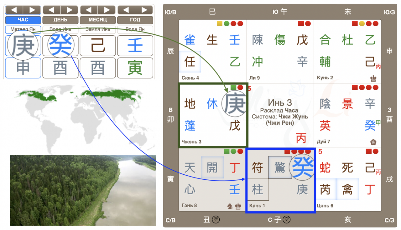 Вопрос – Дело (люди и техника) посмотрим, как Небесный ствол часа Гэн, который находится во Дворце 3 Чжэнь. Во дворце Чжэнь мы видим: Врата Отдых, звезду Небесная Трава, дух 9 земель. Возможно, у людей вышла остановка не по плану, или встретилась опасность . Небесная трава может говорить и о плохой погоде. Врата Отдых – счастливые, у путешественников есть поддержка. Дух 9 земель даёт защиту. Ствол Гэн говорит о проблеме, препятствии, возможной поломке.
