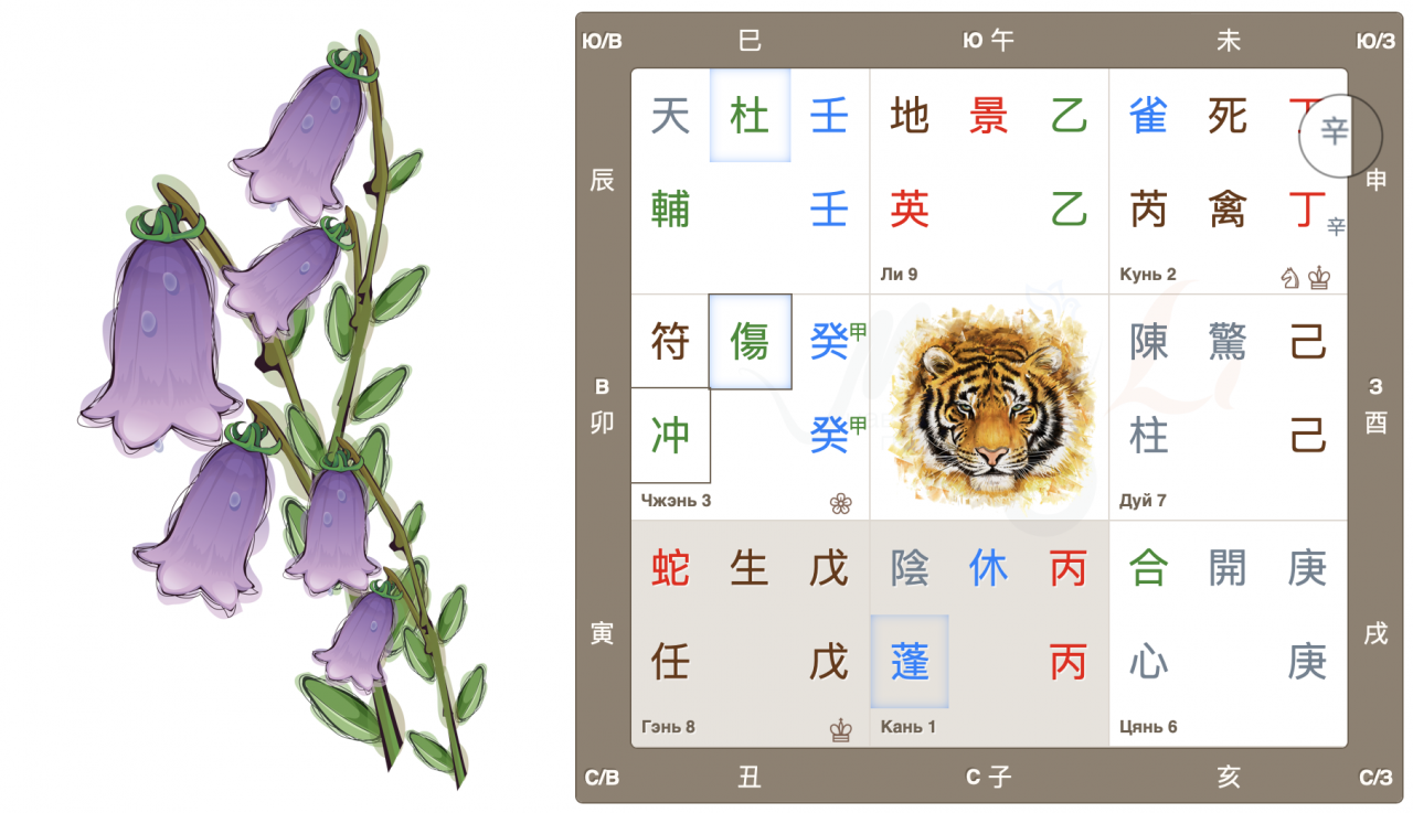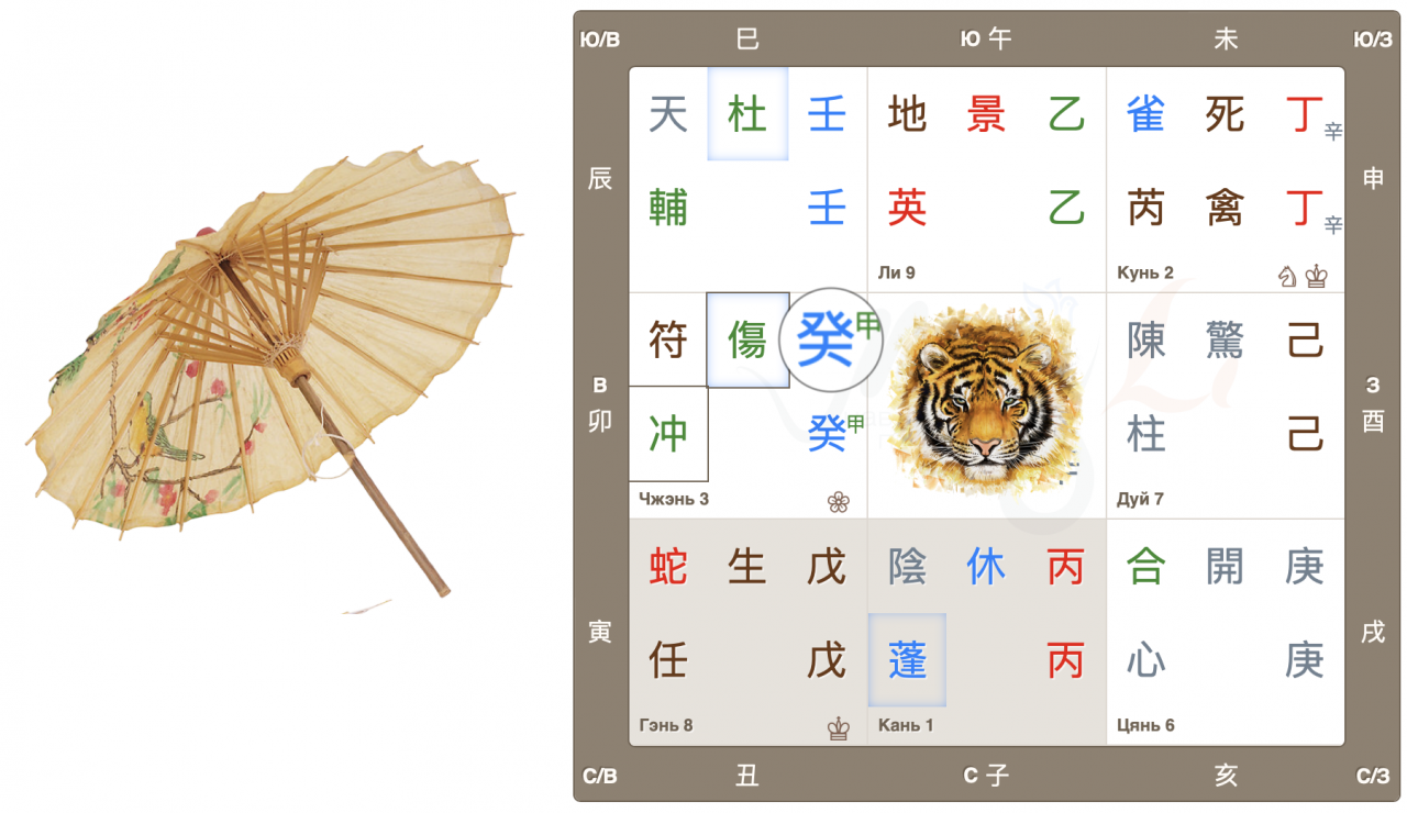 Дворец Чжэнь, движение Дерева, начало нового, быстрый рост. Врата ранения 傷 находятся в своем домашнем дворце и являются главными в раскладе. Это очень активные, азартные врата, жаждущие перемен, перемещений и поездок. Настала весна, время двигаться, и люди этого хотят. Да и родная звезда 冲 также добавляет мощный импульс для начинаний.