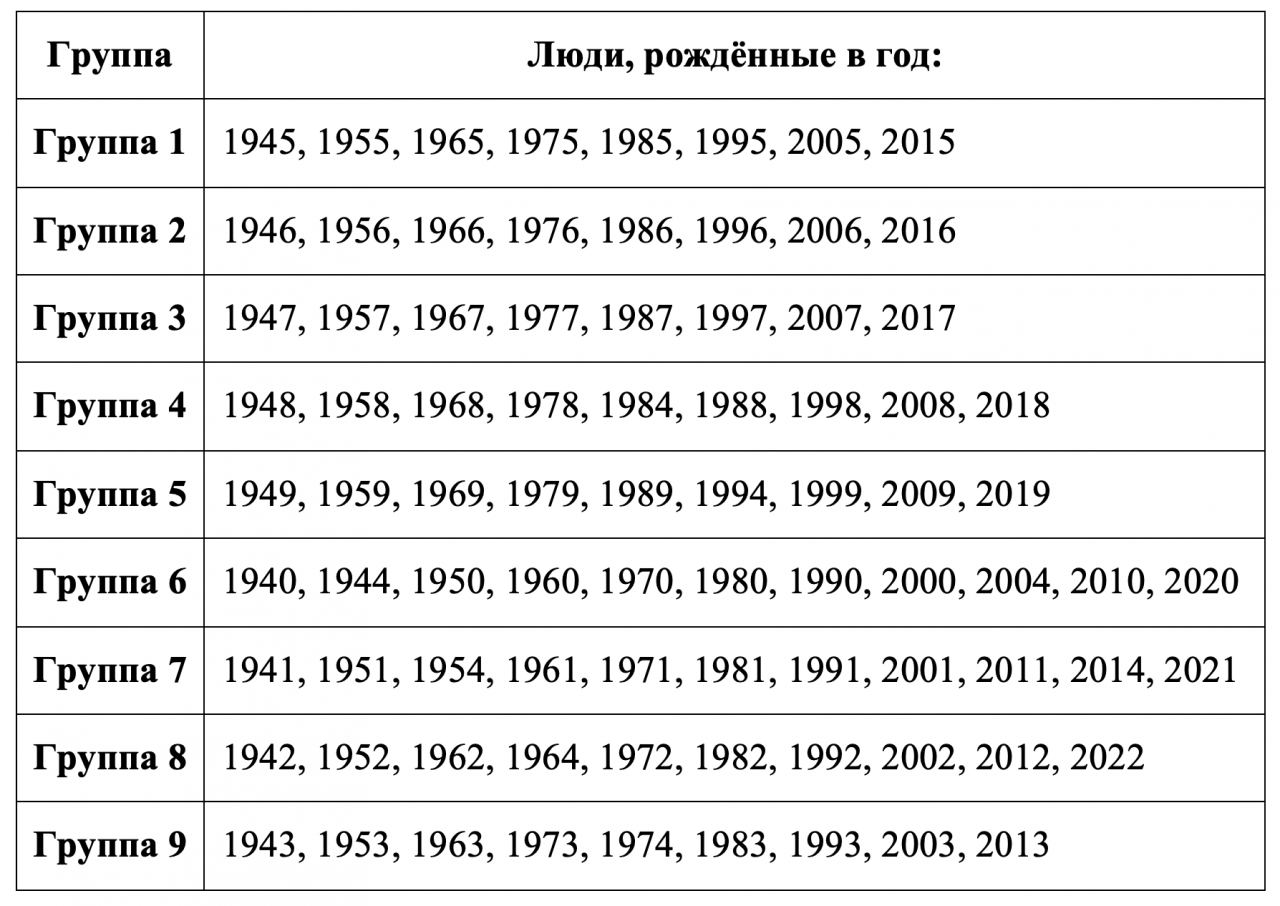 Для удобного чтения мы объединили годы рождения в группы. Найдите свой год рождения и запомните, к какой группе вы относитесь, в тексте прогноза ищите свою группу.
