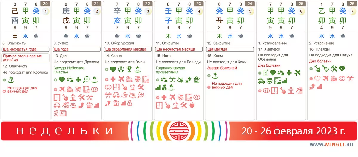 20 февраля, понедельник. Начинается неделька «прекрасно», со столкновения. Поэтому не старайтесь сразу «рвать с места в карьер», начинайте постепенно, учитывая сложность дня. Не рекомендуется заниматься экстремальными видами спорта, лихачить на дороге, начинать лечение. Особенное внимание стоит проявить тем, у кого в карте Бацзы есть Кролик и/или Петух.
