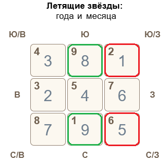 Юго-запад. Здесь весь год гостит хорошая звезда «единица белая», но в соседстве с месячной «двойкой» она теряет свои хорошие качества. Возможны проблемы с желудочно-кишечным трактом, обострение гастрита, заболеваний мочеполовой системы. Если у вас есть предрасположенность к этим заболеваниям, старайтесь здесь проводить меньше времени. Уберите красные предметы из этого сектора, поместите здесь что-то круглое, например белый коврик, или металлические предметы, можно поставить тыкву-горлянку.