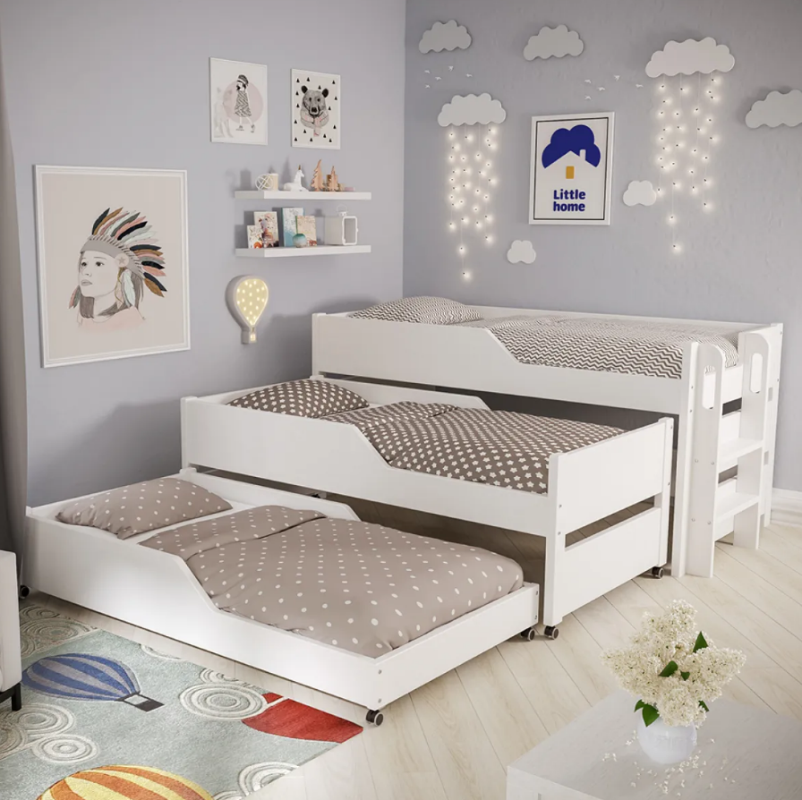 В конце концов, купите классическую двухярусную кровать, проверьте только, что конструкция выглядит надежно, и у каждого ребенка достаточно места над головой.
