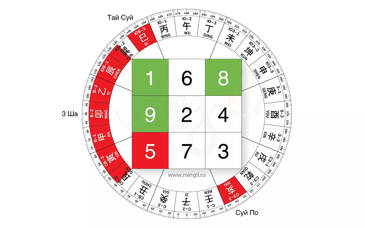 Разрушитель Года, Суй По, находится напротив, на северо-западе 3. Это место тоже лучше не тревожить ремонтом, разрушением земли, долго работающими активизаторами. Беспокойство этого сектора более серьезно, чем беспокойство Тай Суй, и чревато серьезными заболеваниями. Если тыл вашего дома расположен на северо-западе 3, то ремонт противопоказан во всем доме, а земляные работы – на всем участке. Также в дома с таким тылом не рекомендуется въезжать в 2025 году. Спать или работать здесь можно, если вы не родились в год Свиньи или Змеи.
