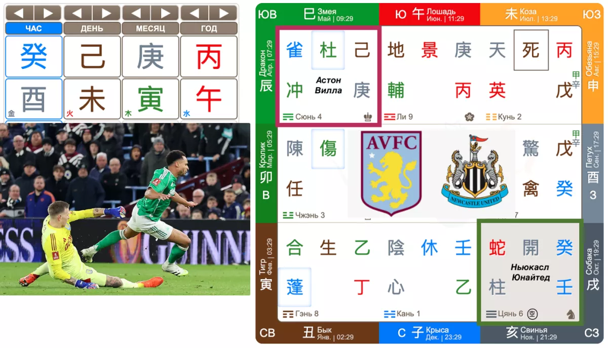 В раскладе хозяин матча - команда «Астон Виллы», представленная небесным стволом дня , грациозно опустилась во дворец Сюнь. А команде «Ньюкасл Юнайтед», представленной  небесным стволом часа  достался дворец Цянь.