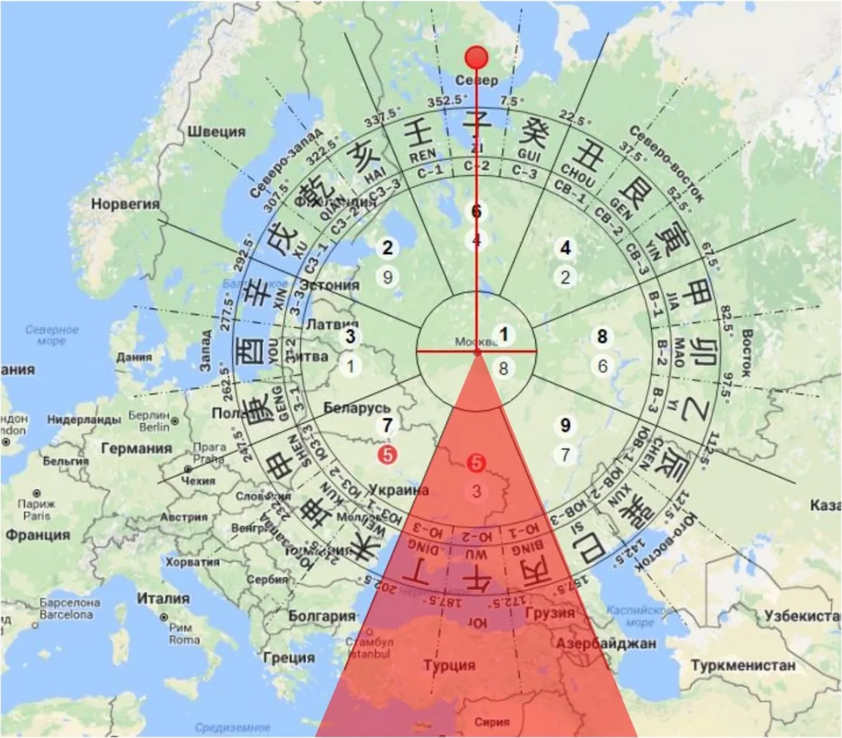 Определять эти направления нужно от вашего города. Китайцы чаще всего делают это по плоской карте, то есть без учета кривизны земной поверхности. У нас принято определять направления с учетом этой кривизны. На небольших расстояниях проще использовать азимуты. Если же речь идет о путешествиях через пол земного шара - рекомендую вам посмотреть на глобус.