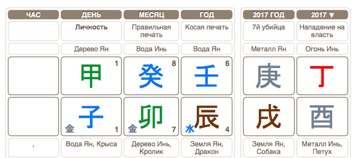 子 (дневной столп) и 卯 (месяц) суммарно дают нам наказание нелюбви, дающее отсутствие лояльности и хождение по головам. Крыса и Кролик являются Цветками Персика, а также говорят о проблемах сексуального характера и даже насилии. В частности, такие черты активизируются, если являются для человека неполезными элементами, а вода для него, как мы выяснили, ничего хорошего не несет. Если хотите, представьте дерево с прогнившими корнями. Так как комбинация затрагивает день или также дворец супругов, данные проблемы негативно отражаются на его жене и нем самом.