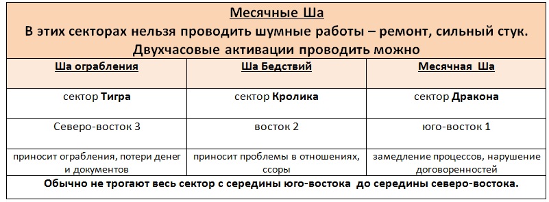 Юго-восток.  Отличный сектор! Здесь собрались две «белые» звезды 1 и 8, способствуют финансовому росту и новым полезным знакомствам. Хорошо здесь готовится к экзаменам. Осторожней в этом секторе нужно быть маленьким мальчикам (могут быть заболевания ушей), а также пожилым мужчинам.  Очень хорошо проводить здесь активации, можно поставить Мобил на три месяца, до 7 августа! Запустить его можно 10 мая в час Тигра (день не подходит для тех, кто родился в год Обезьяны). Или 11 мая в час Дракона (не подходит для родившихся в год Петуха).