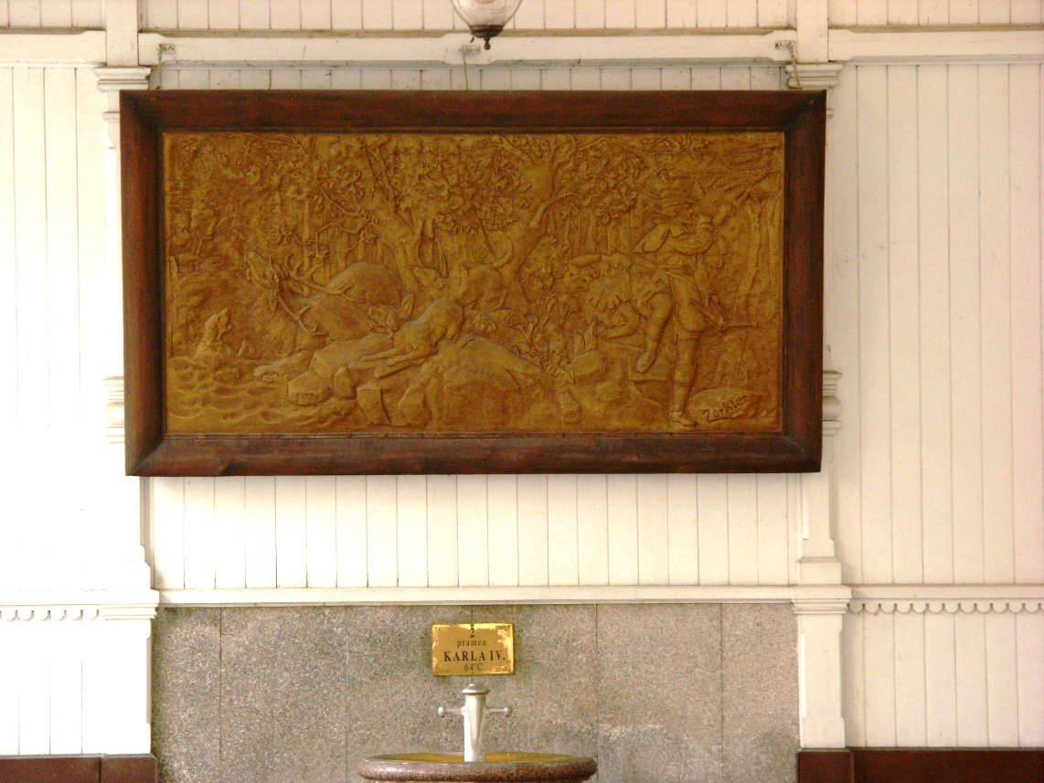 Обнаружение целебных источников относят к 14-му веку. Тогда на месте города были заповедные леса. Согласно легенде, во время охоты короля Карла IV поранилась его любимая собака. Она нашла источник с водой, искупалась в нем и очень быстро ее раны затянулись. Поскольку в средние века люди воевали много, а врачебной помощи практически не было, становится понятно, почему источник с волшебной водой не проигнорировали. Король и сам опробовал на себе действие термальных вод и получил облегчение своим болезням. И тогда он повелел заложить здесь город. Его название отражает часть легенды и показывает высокую статусность вод – ведь это воды самого короля Карла! -  короля, которого очень уважали подданные. Кстати, источник №2 в Карловых Варах носит имя короля Карла IV. Говорят, это тот самый источник, положивший начало городу. На стене возле источника находится барельеф с изображением сцены охоты короля.