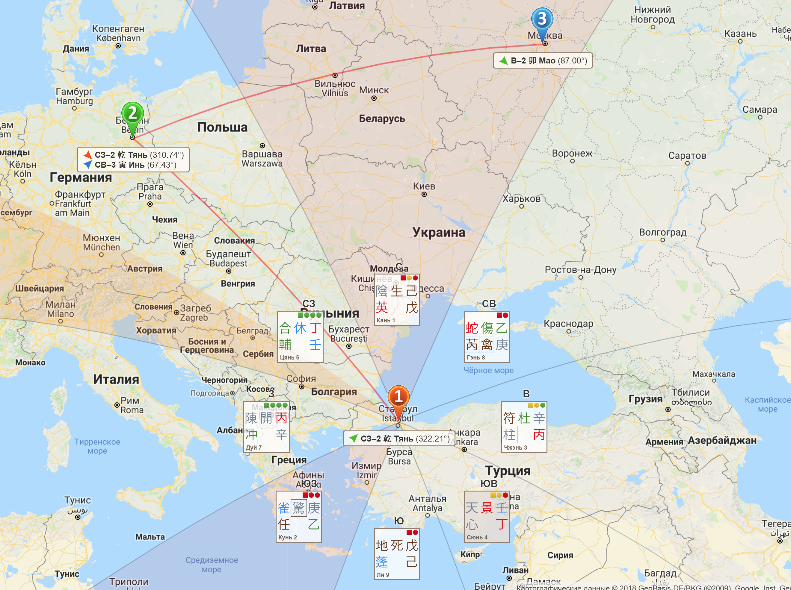 - Азимуты на сфере: учитывают сферическую форму земной поверхности при определении направления. Китайские мастера определяли и определяют направление по картам, не учитывая кривизну Земли. Вы можете поступать также, отключив азимуты на сфере. Кстати, используя кнопку «Радиус», вы можете менять протяженность секторов направлений на плоской карте. Однако, времена меняются и человек сегодня способен преодолеть огромные расстояния всего лишь за сутки-двое. В такой ситуации, особенно при движении ближе к полюсам, разумнее учитывать сферическую форму Земли, так как карта передает очертания и расположение материков с достаточно большими искажениями. Поэтому мы рекомендуем смотреть направления для поездок с учетом азимутов на сфере.