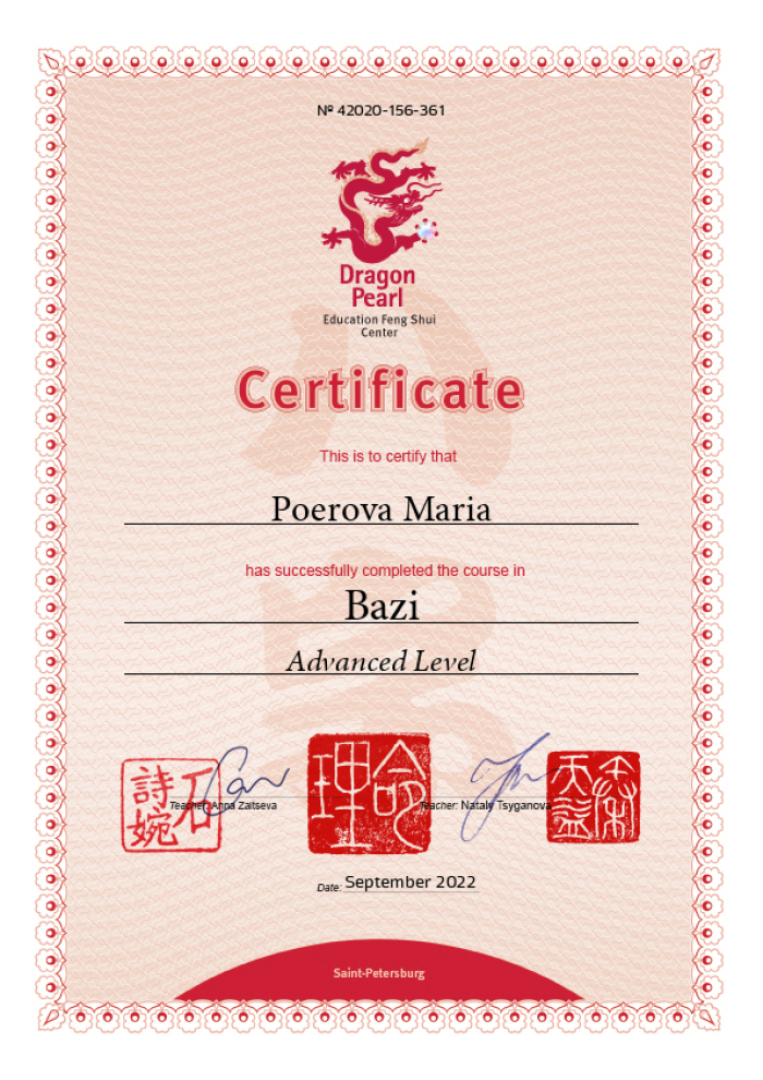 Меня зовут Мария, я сертифицированный консультант центра «Жемчужина Дракона» по фэн-шуй и бацзы.