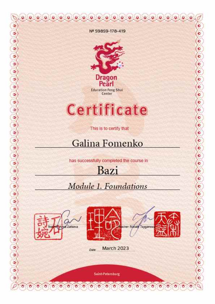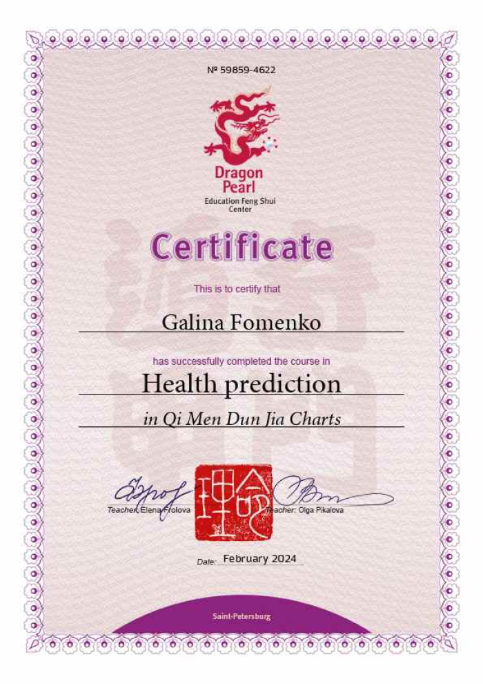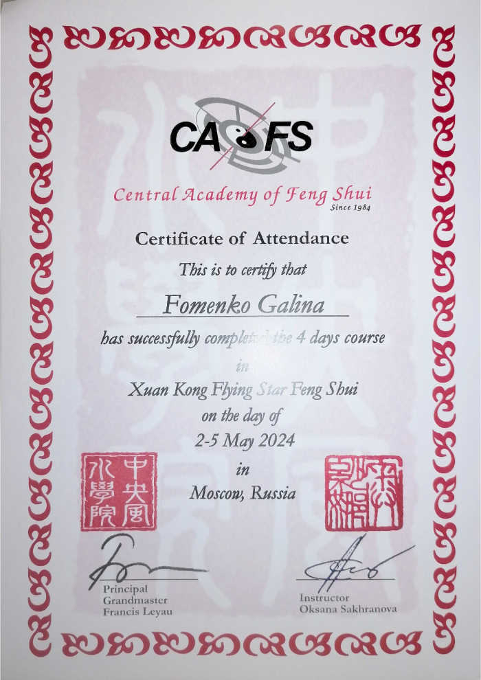 Меня зовут Галина. Являюсь сертифицированным консультантом по специализации «Фэн шуй» центра обучения и консультирования "Жемчужина дракона".